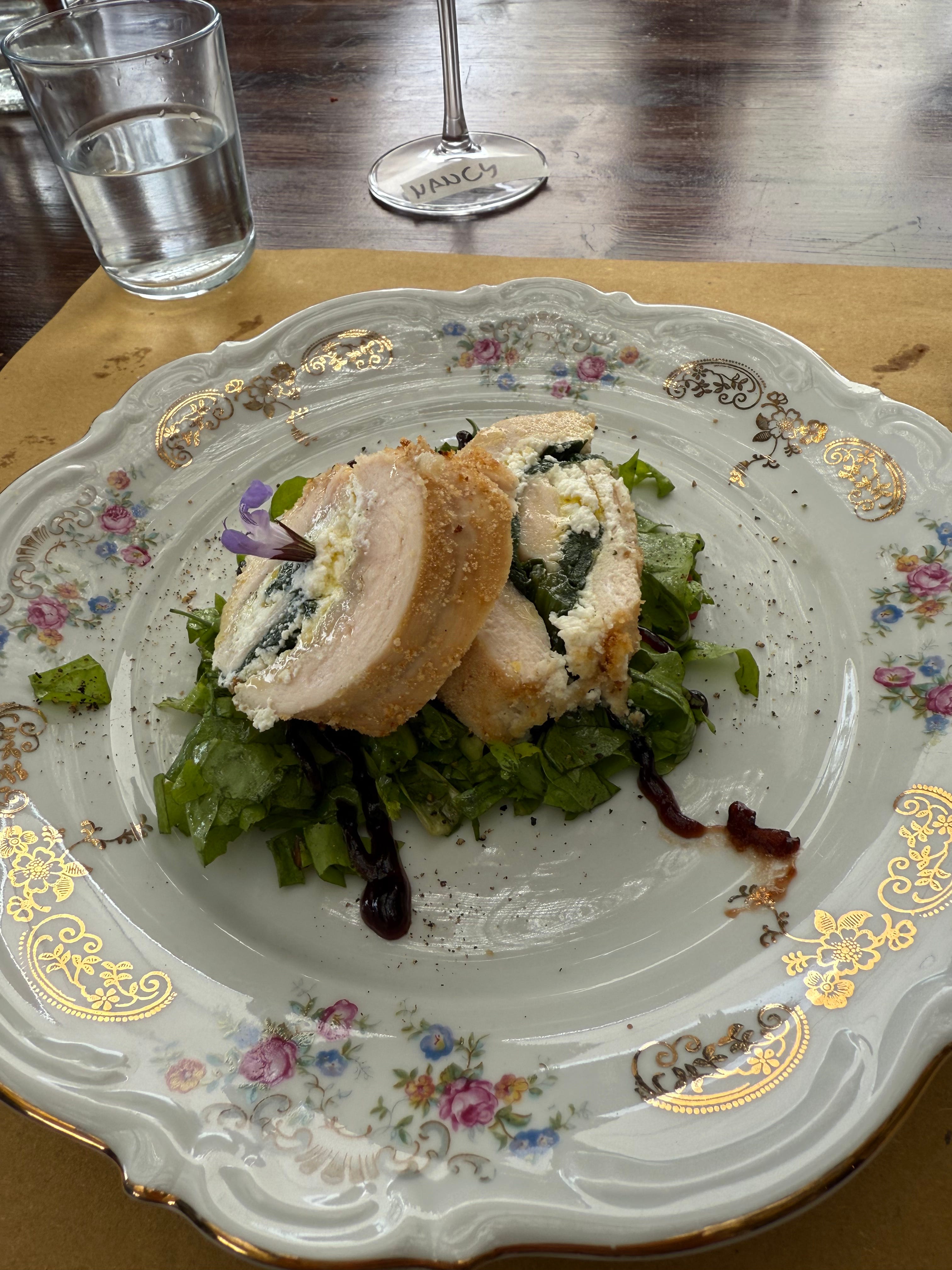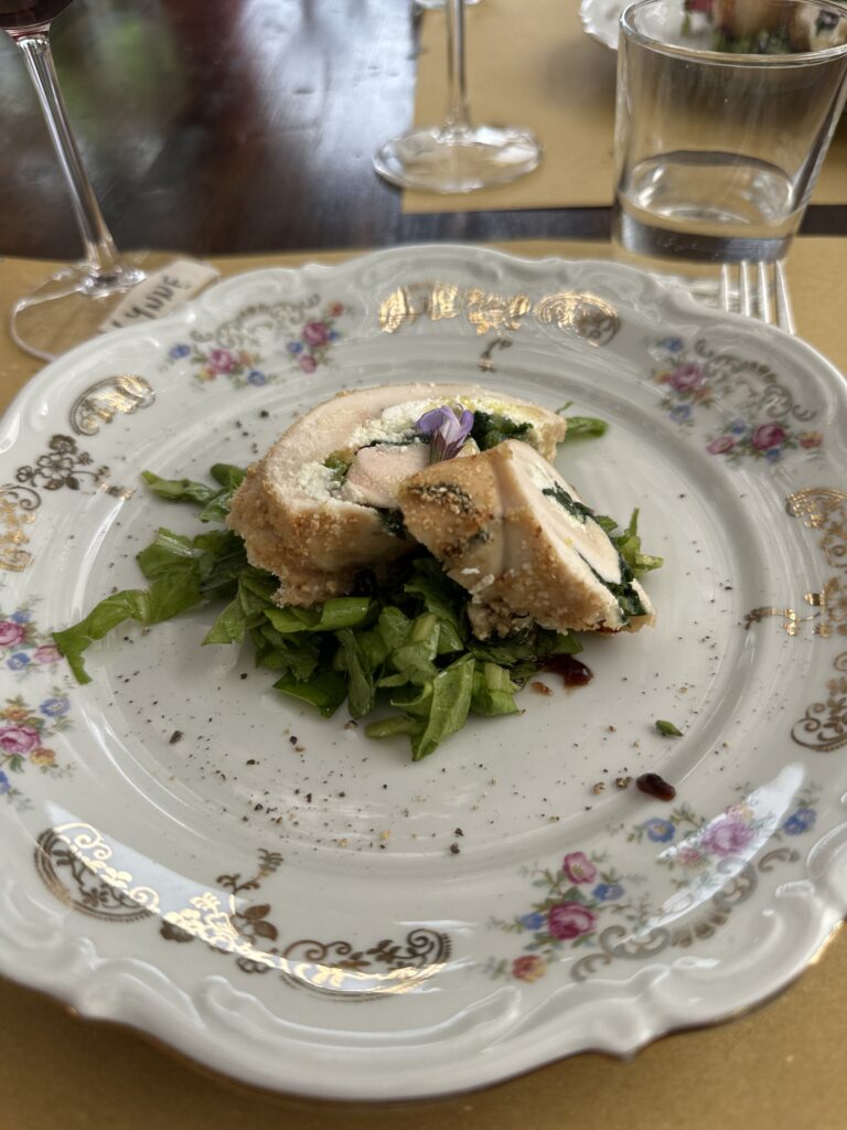 We made several dishes that day, but the one that stayed with me most was this beautifully rustic stuffed chicken. It started with thinly pounded chicken breasts, gently filled with creamy ricotta, a sprinkle of Parmesan, and a handful of sautéed greens — spinach or chard, whatever is fresh and on hand. Rolled tight like a little present, it was dredged in seasoned flour, dipped in egg, and coated in breadcrumbs before going in the oven.